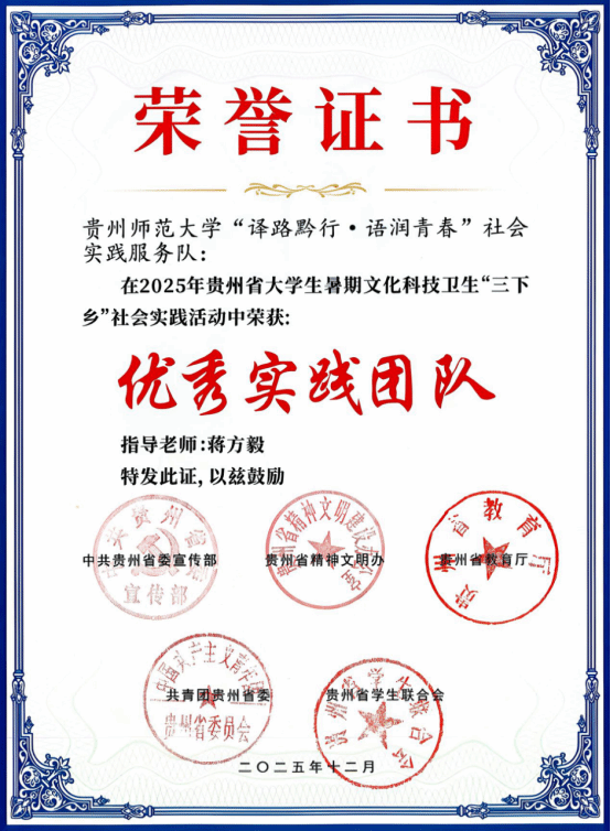 近期,中共贵州省委宣传部等五部委公布2025年贵州省大学生暑期文化科技卫生“三下乡”社会实践活动评审结果,经学校团委推荐和主办方评审,我院“译路黔行·语润青春”社会实践服务队荣获2025年贵州省大学生暑期文化科技卫生“三下乡”社会实践活动优秀实践团队荣誉称号。至此,我院已连续五年斩获该项荣誉。