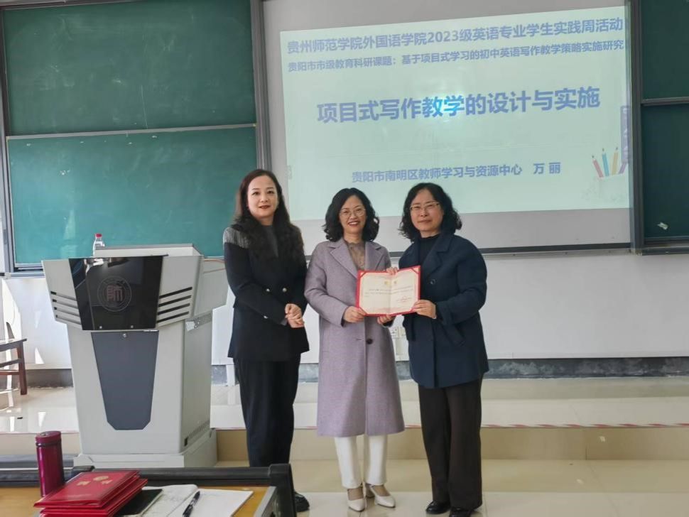在近日,首届 “香樟教学节”期间,外国语学院开展 “名师进校园” 活动,助力英语专业师范生成长,活动特邀贵阳市第十四中学李燕、贵阳市南明区教师学习与资源中心万丽、贵阳一中吕燕丽三位一线教学名师,围绕项目式教学、教师测评素养等关键议题开展专题分享。三场干货满满的讲座串联起实践教学周的核心脉络,为 2023 级英语专业师范生搭建起理论与实践深度融合的桥梁,彰显了校地联动共育教育人才的鲜明导向。